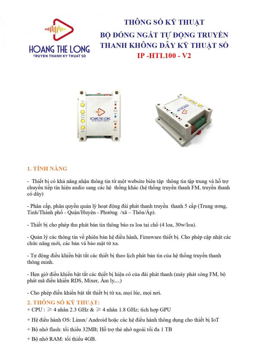BỘ ĐÓNG NGẮT TỰ ĐỘNG TRUYỀN THANH KHÔNG DÂY KỸ THUẬT SỐ IP -HTL100 - V2
